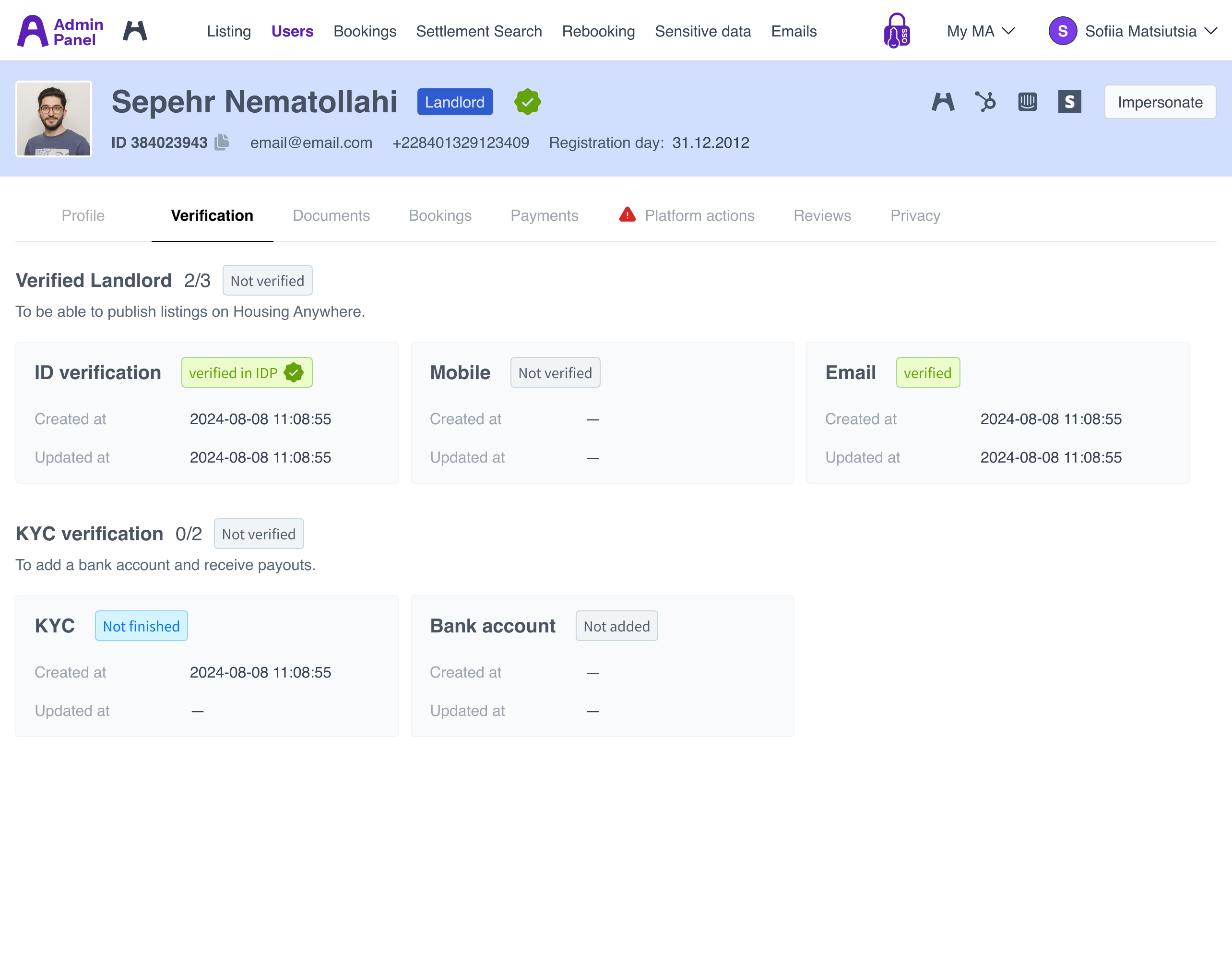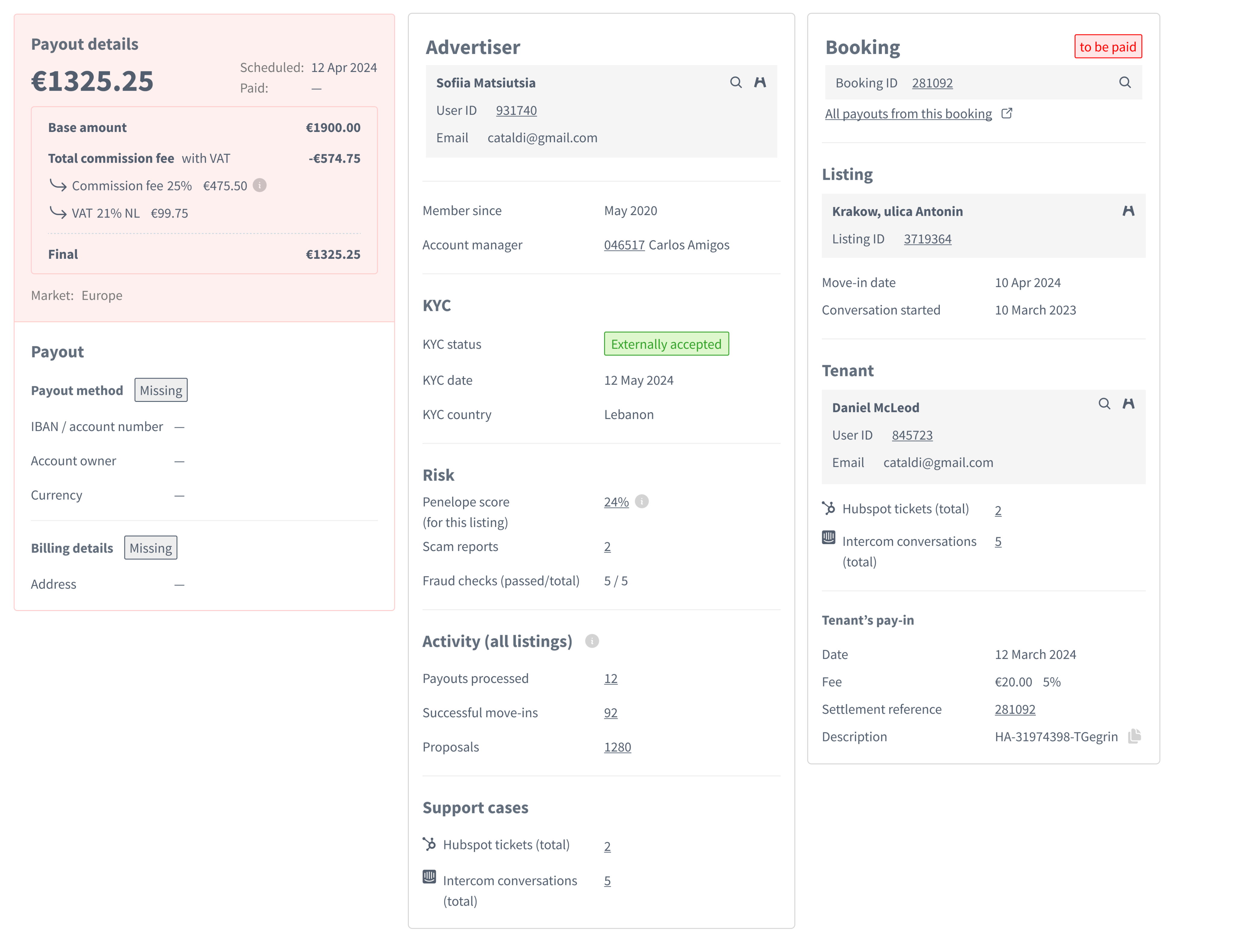 Instead of jumping between 6 tools, I brought relevant data into the Admin Panel. For example, User profiles now show everything in one place: tenant details, landlord info, payment history, actions, next steps.