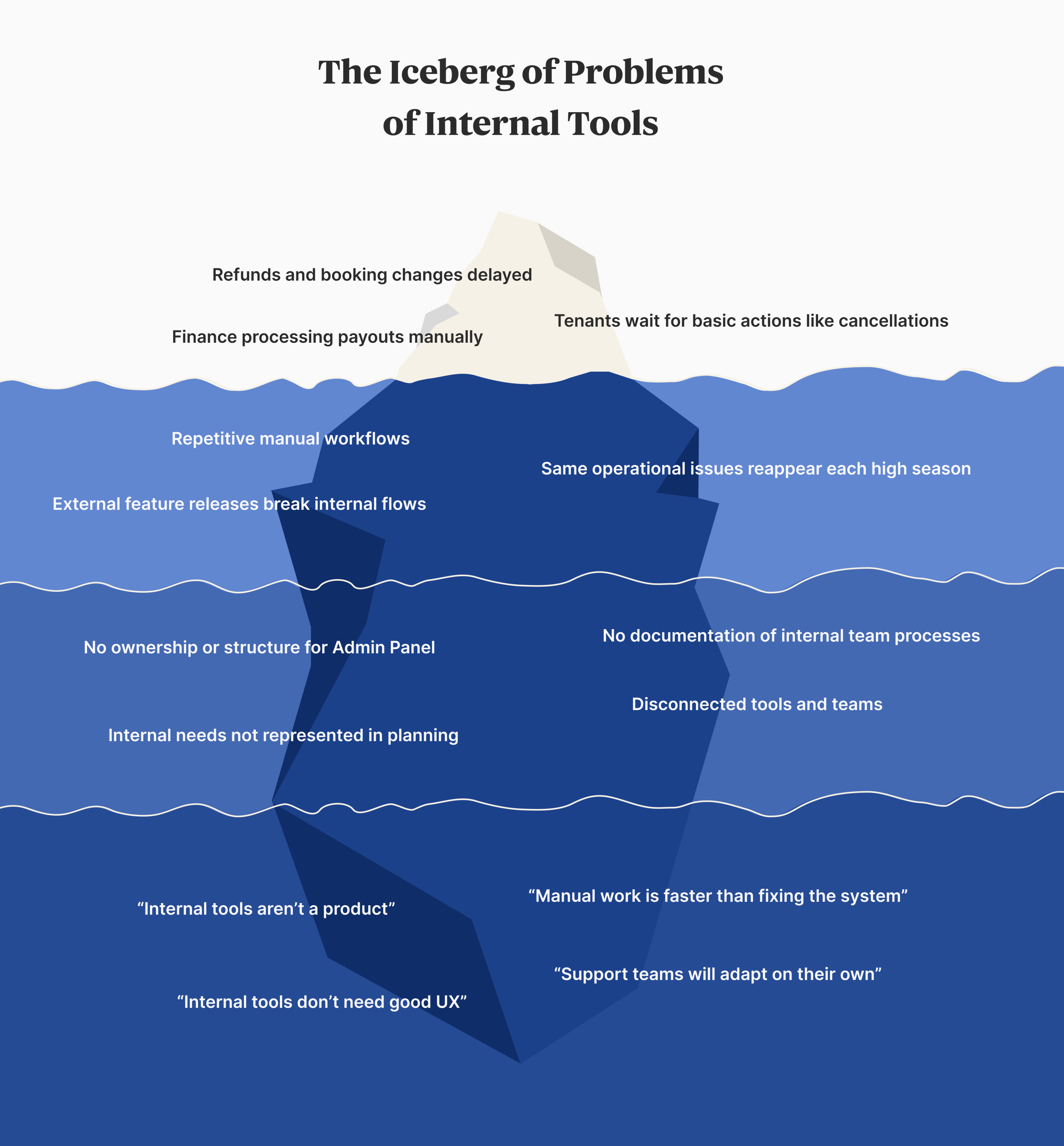 Behind the scenes, Customer Support, Finance, Trust & Safety, Sales, and Marketing all use an Internal Panel to manage bookings, users, and payments. But it had grown into a mess. Teams were switching between tools and doing things manually that should have been automated.