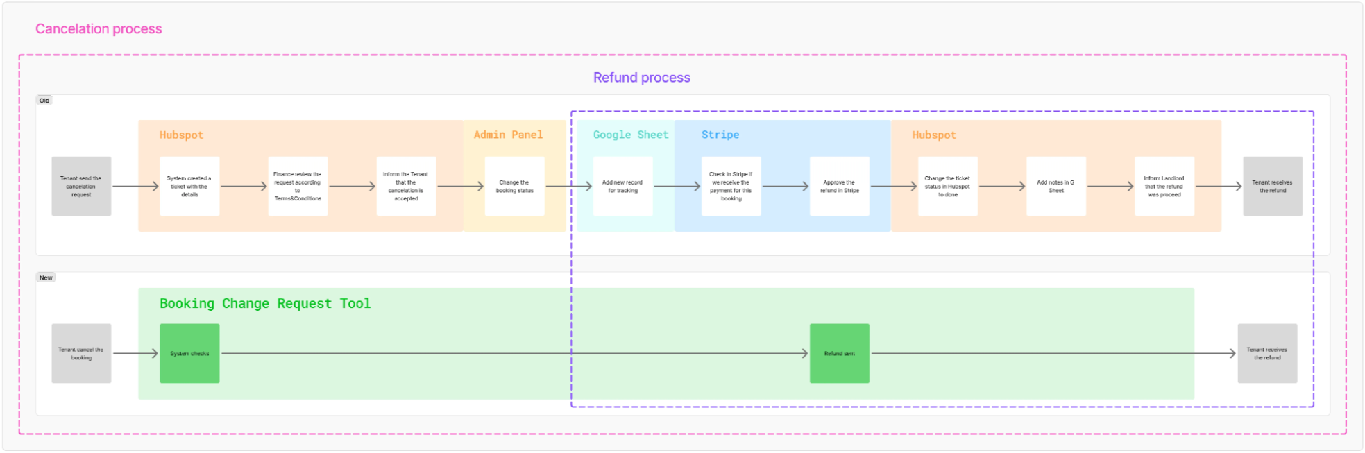 Before the BCR Tool was introduced, fully manual process of canceling or modifying a booking was prone to human error, scattered across 5 tools (Front Office application, HubSpot, Intercom, Moneta, Google Sheets), difficult to track, and not scalable.