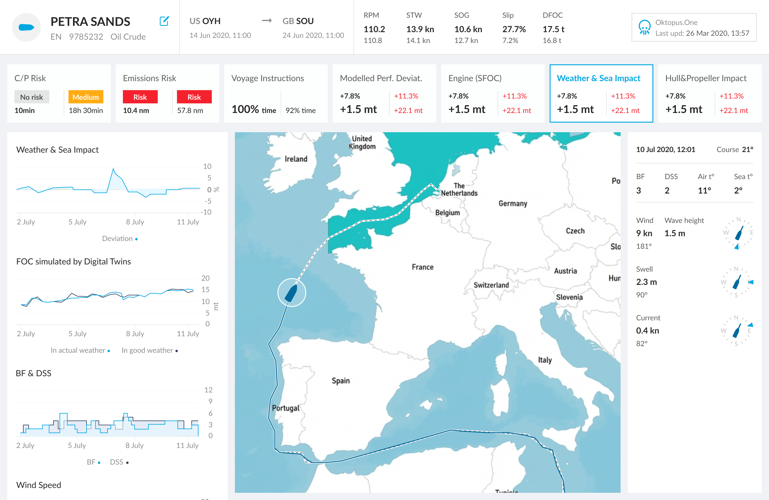 Real-time dashboard with vessel KPIs, map, compass, and sensor data